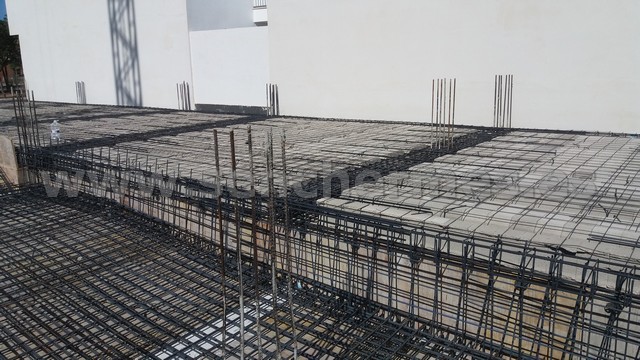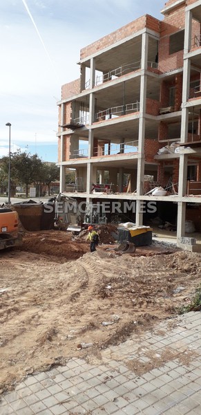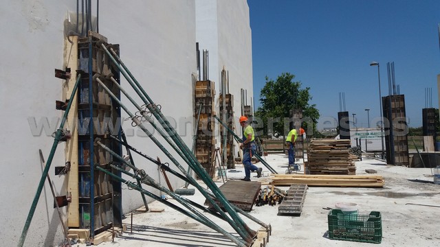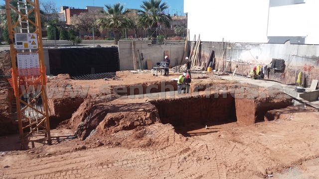 Vista de la excavación del sotáno, el armado de uno de los forjados y de los encofrados de pilares de medianera.