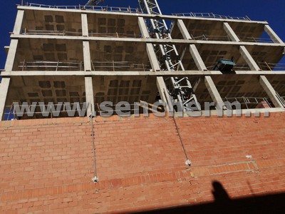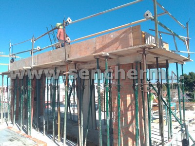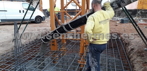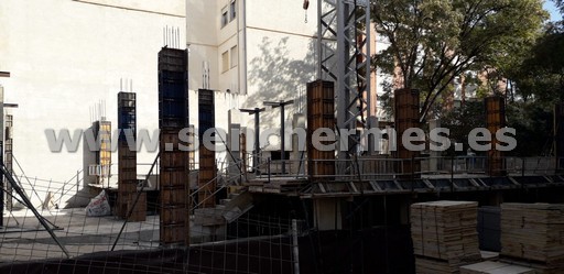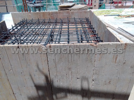 Vistas del hormigonado de la losa de cimentación, del levantamiento de pilares en forjados a dos alturas, y del edificio ya desencofrado. Vista del casetón y de la losa del ascensor en cubierta.