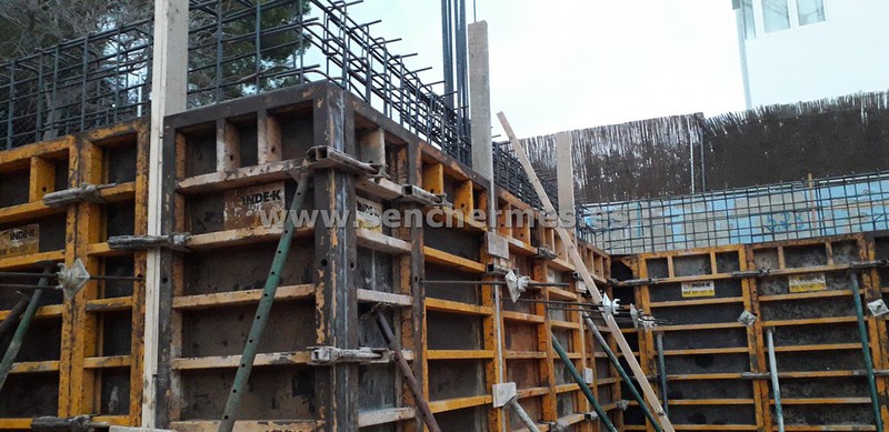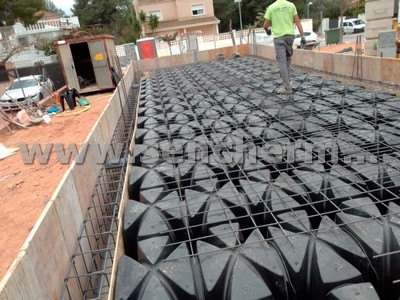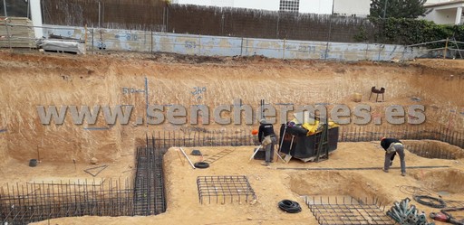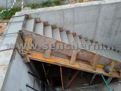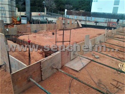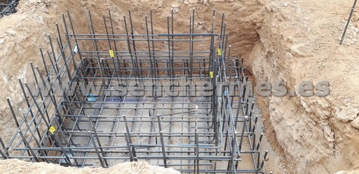 Cimentacion y estructura de hormigón armado, con pilares metálicos y de hormigón. Solera ventilado tipo "caviti". Escalera peldañeada de hormigón.
