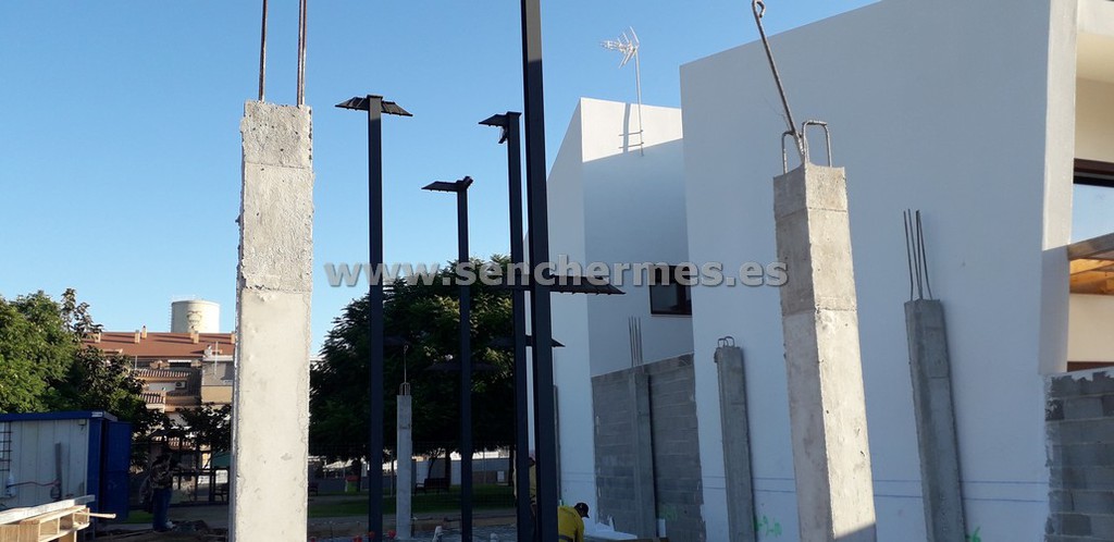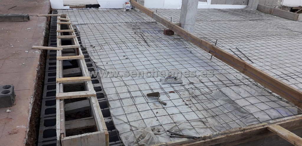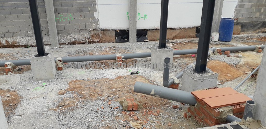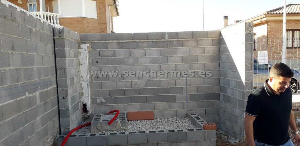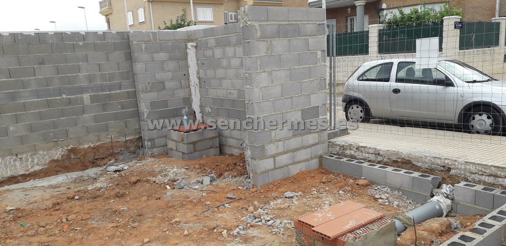 Ejecución de saneamiento y fábrica de bloque en perímetro para contener la machaca bajo solera y para apoyo de forjado de cuarto auxiliar.