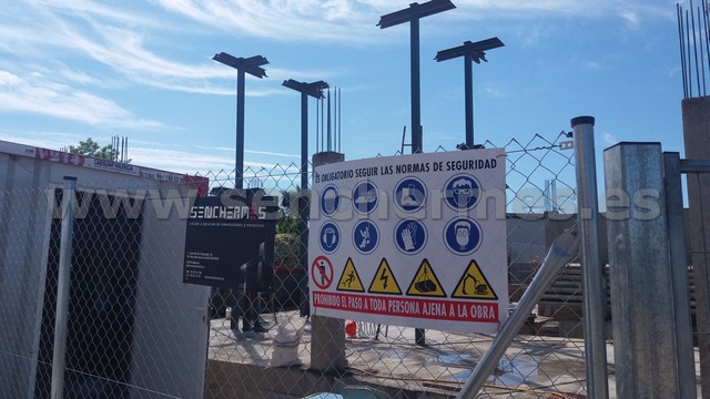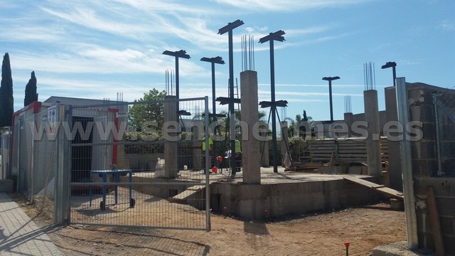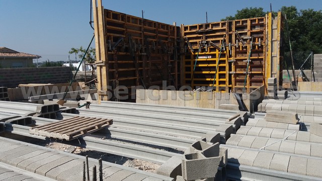 Vista del encofrado de muro visto y vista general del forjado sanitario con pilares metálicos